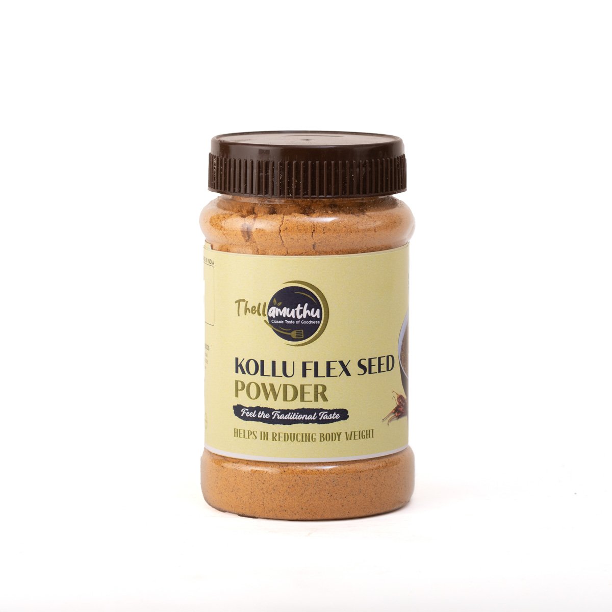 Our premium Kollu Flax Seeds Podi is a wholesome South Indian spice blend made with protein-rich horse gram (kollu), omega-3 rich flax seeds, aromatic coriander seeds, cumin seeds, black pepper, and dry red chillies. Expertly roasted and ground to perfection, this healthy podi powder is packed with essential nutrients, fiber, and antioxidants that support weight loss, digestion, and overall wellness. The perfect balance of spice and nutrition makes it an ideal accompaniment for hot rice, idli, dosa, and other traditional meals. Free from preservatives and artificial additives, this natural kollu flaxseed podi delivers authentic homemade taste with powerful health benefits.
